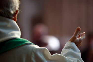 Close up image of a Catholic leader raising his hand.