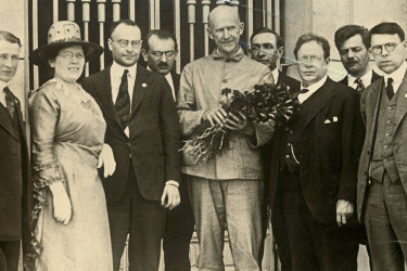 Black and white photo of Eugene Debs being released from an Atlanta federal prison on Christmas Day, 1921.